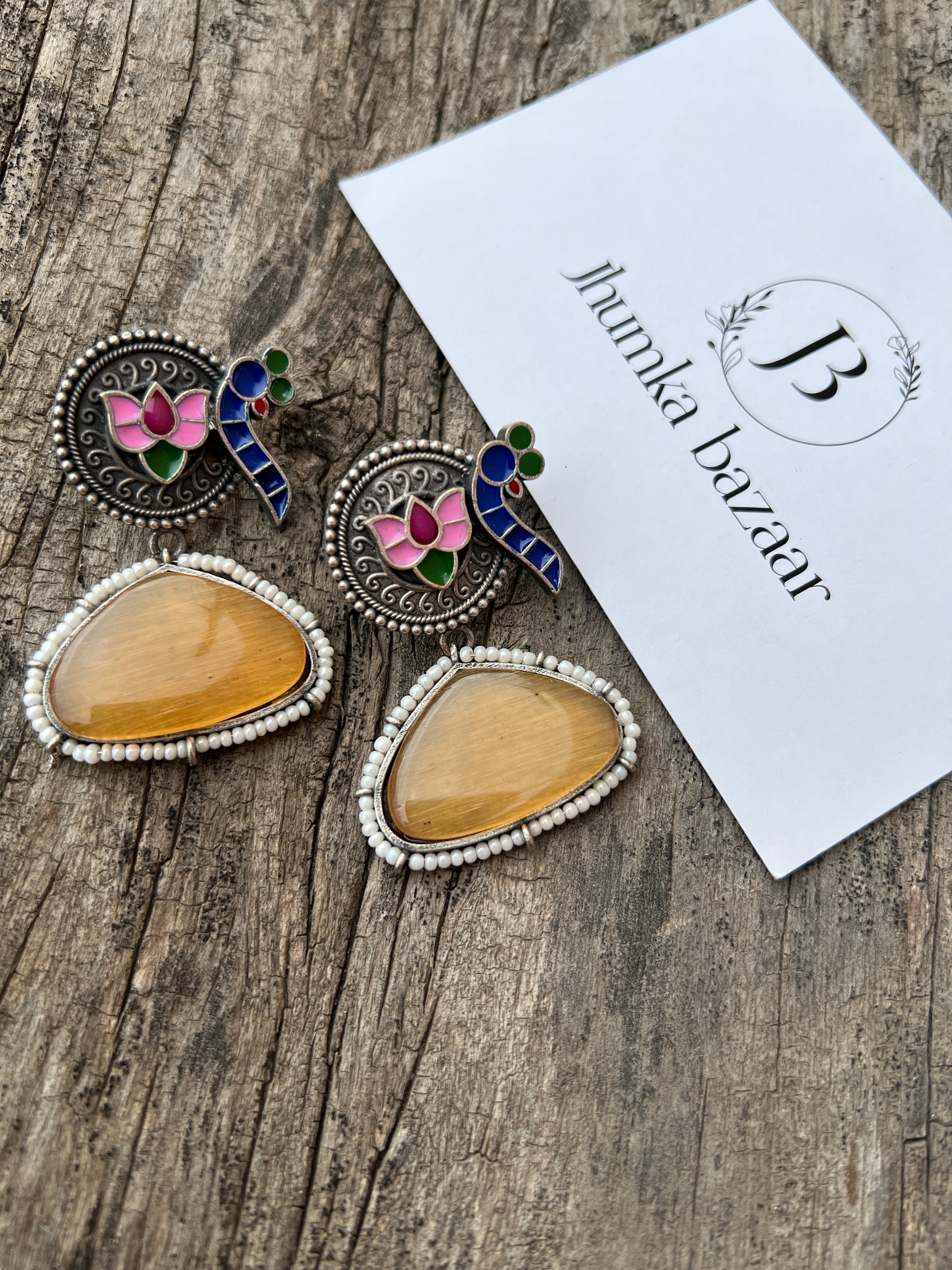 Handpainted Peacock Earrings | Best Monalisa Stone Stud with Lotus Touch- Yellow