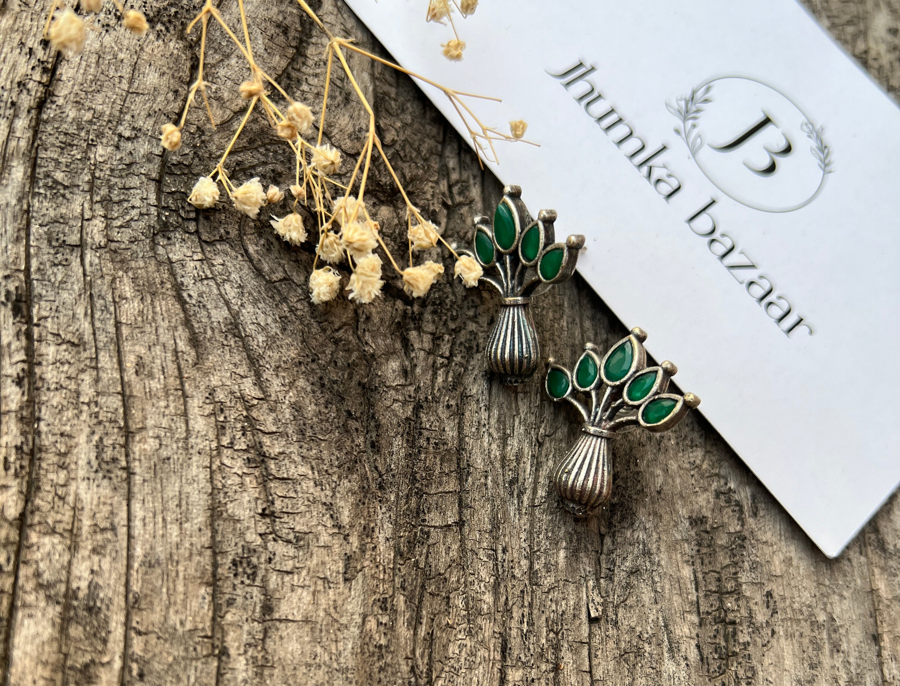 Stylish Amazing Flower Pot Earrings In Silver Finish With Stone- Green
