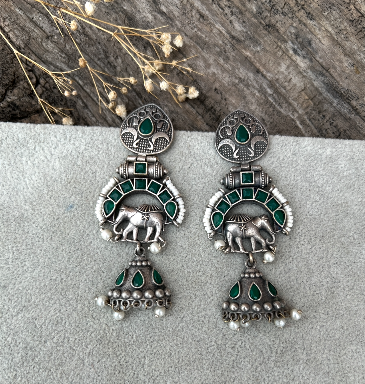 Royal Elephant Brass With Pearl Earring- Statement - Green
