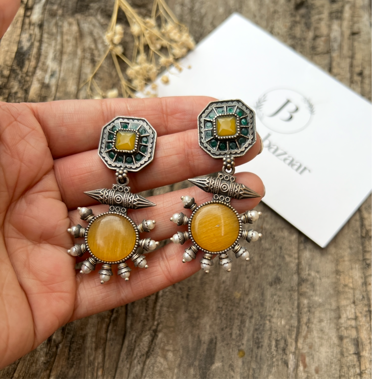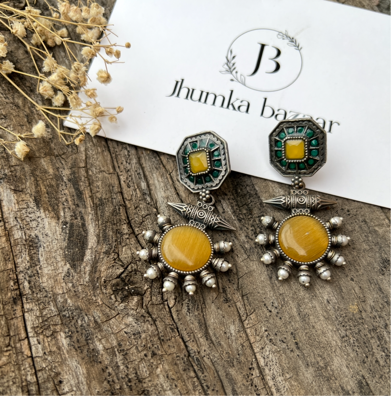 SILVER REPLICA EARRINGS WITH MONALISA STONE & ADORABLE PEARL WORK- YELLOW GREEN