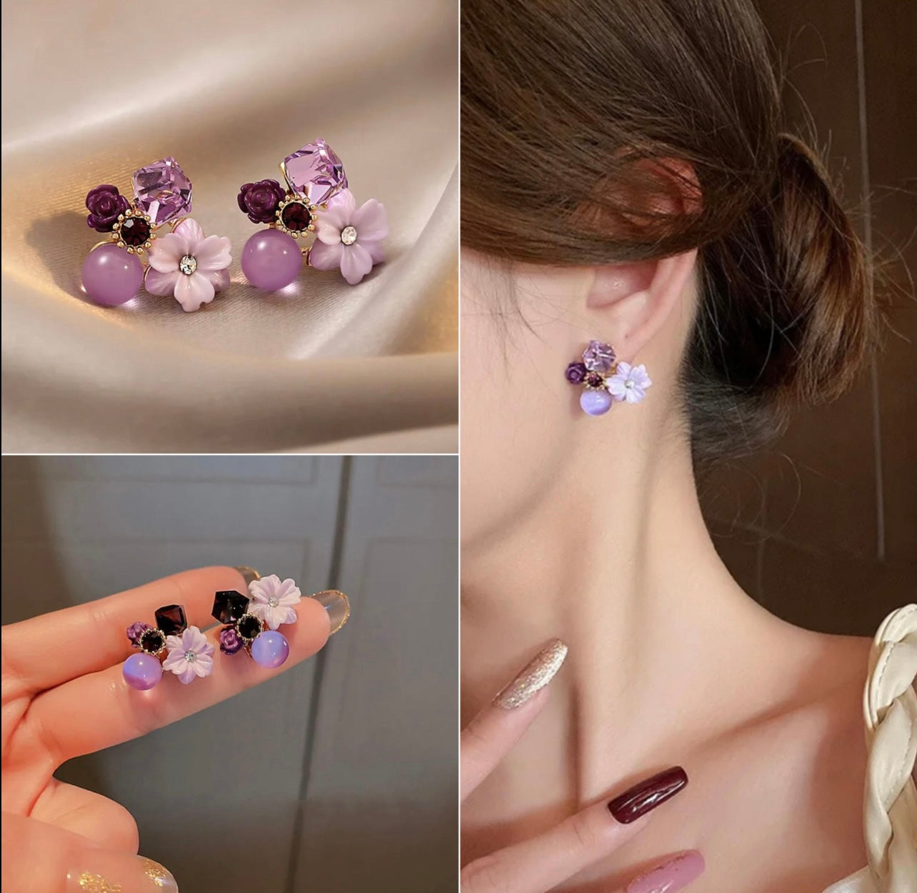 Simple Korean Style Flower Plating Inlay Alloy Rhinestones Cat's Eye Stone Ear Studs