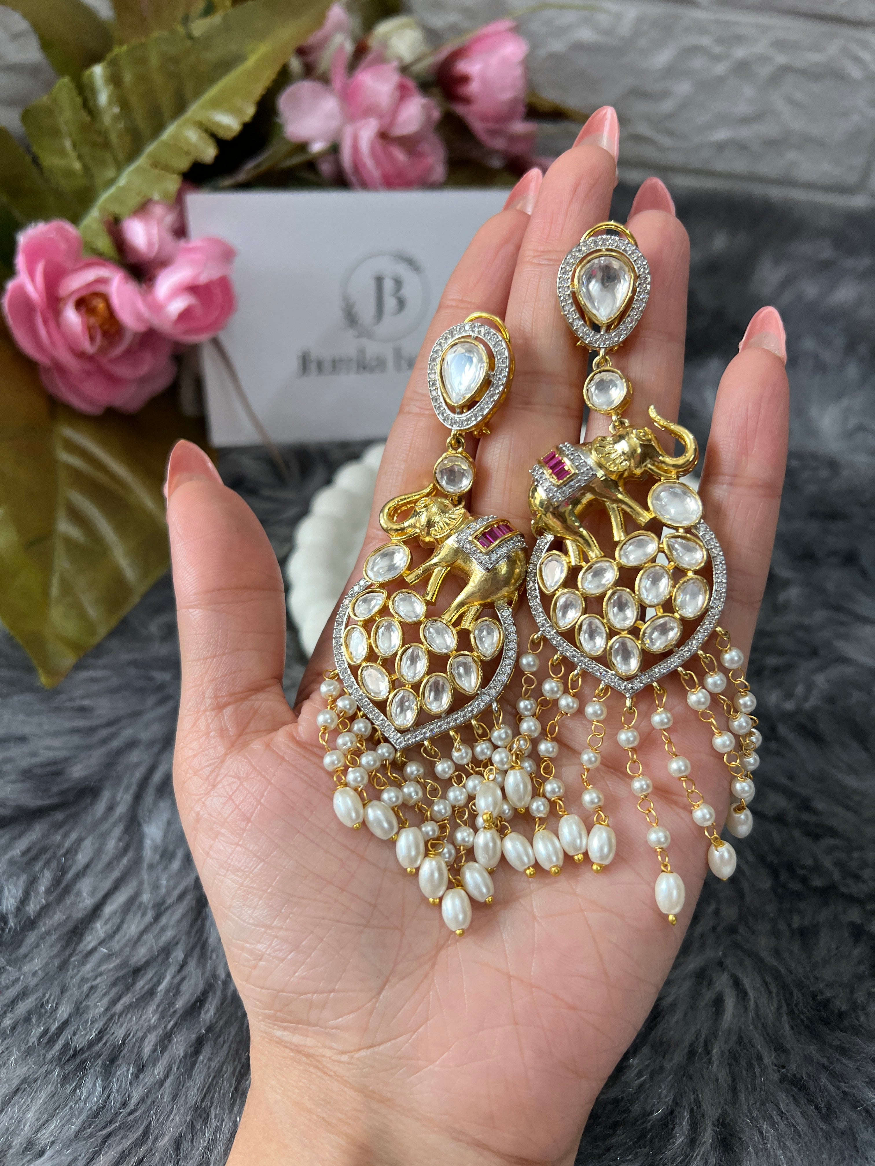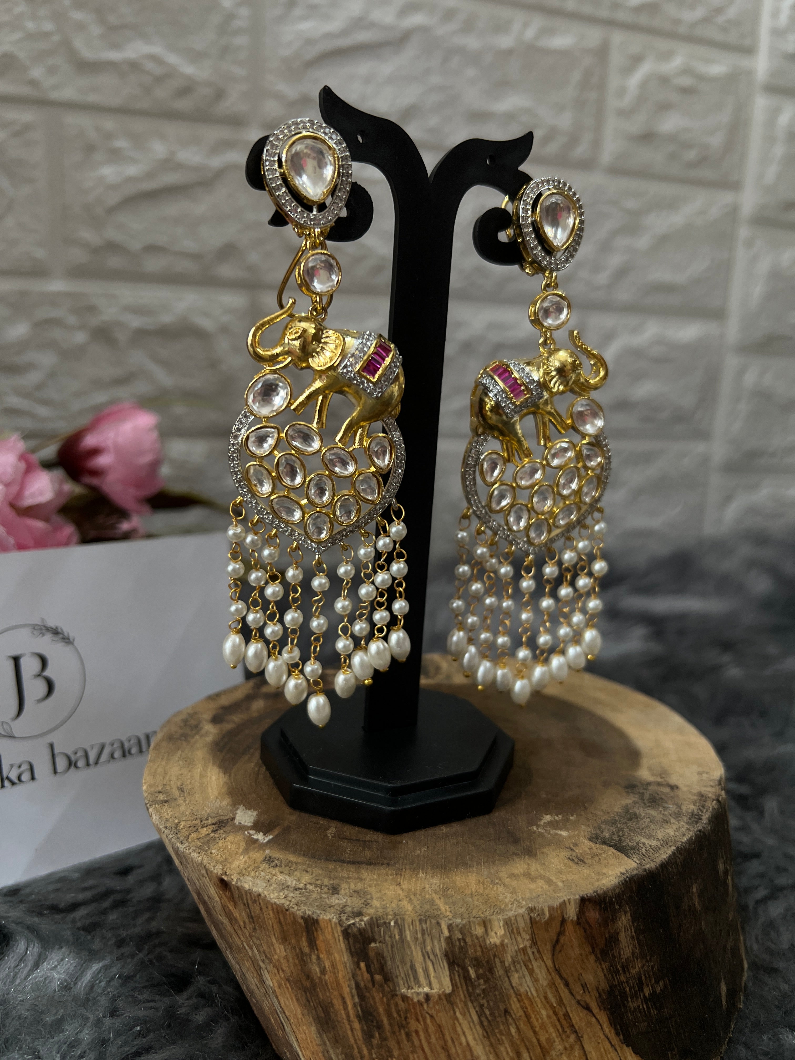 Gold Plated Kundan Elephant Earrings With Pearls Hangings