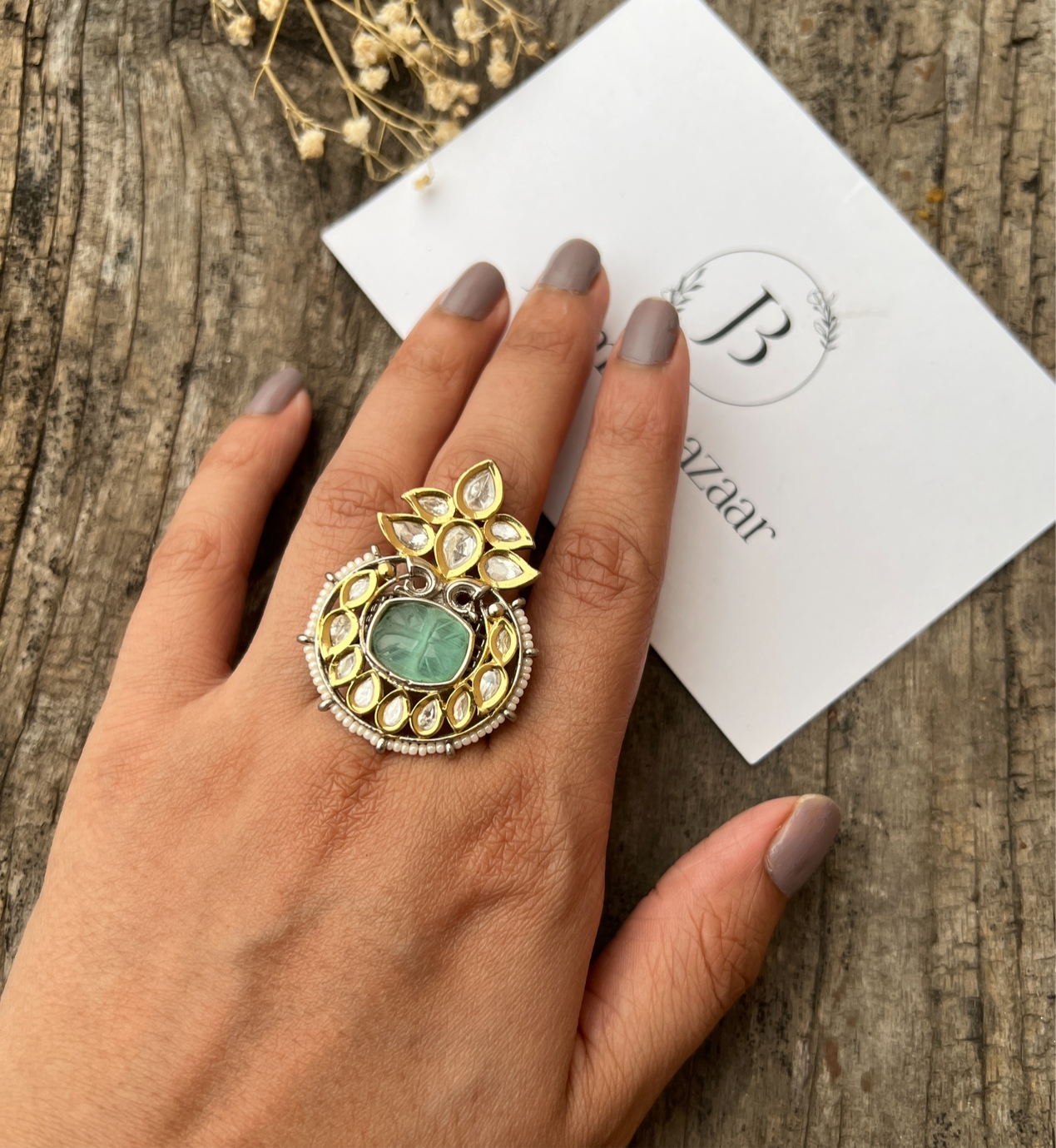 Polki Kundan Kalash Style Dual Tone Adjustable Ring With Carving Stone - Mint