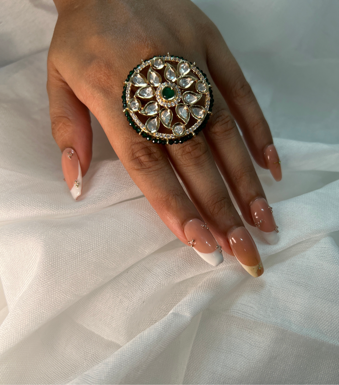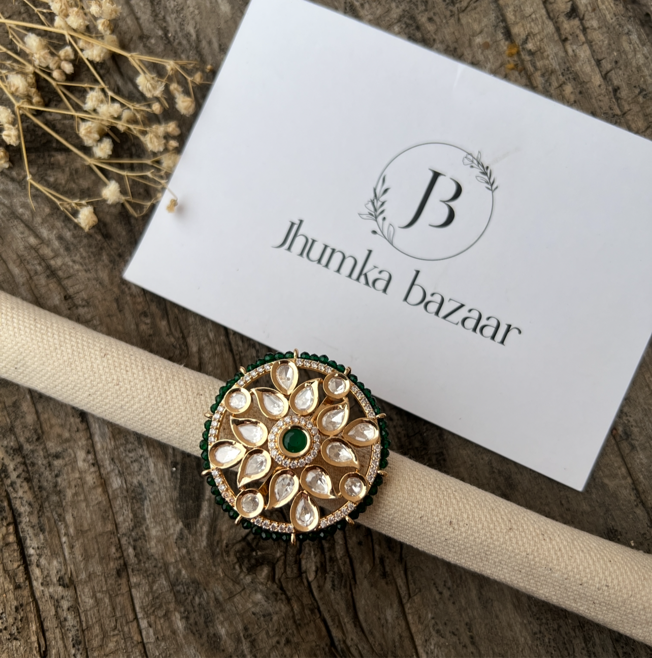Real Kundan Round Shaped Adjustable Finger Ring - Adjustable- Green