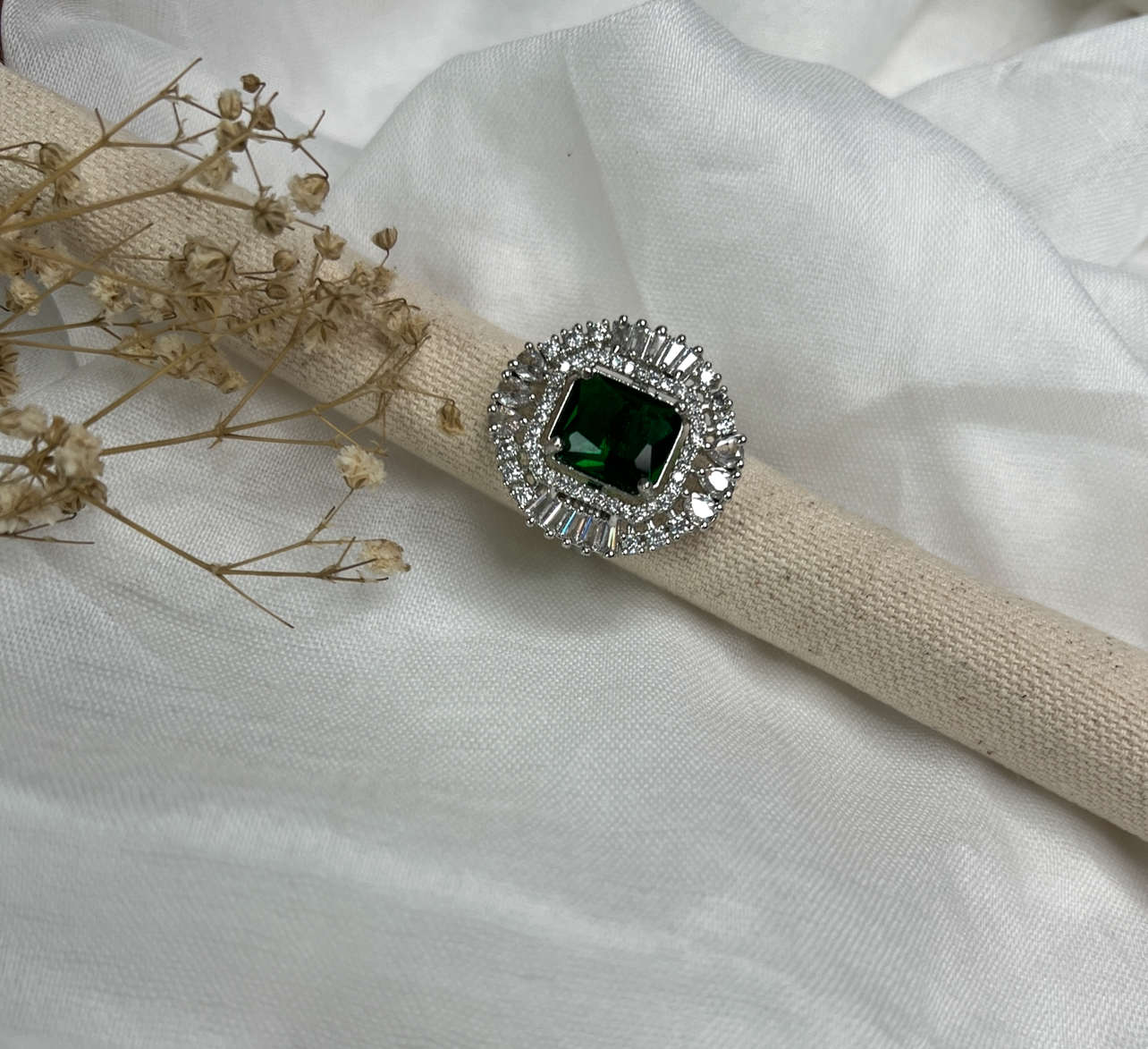 Silver Plated American Diamond With Green Stone Adjustable Ring