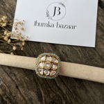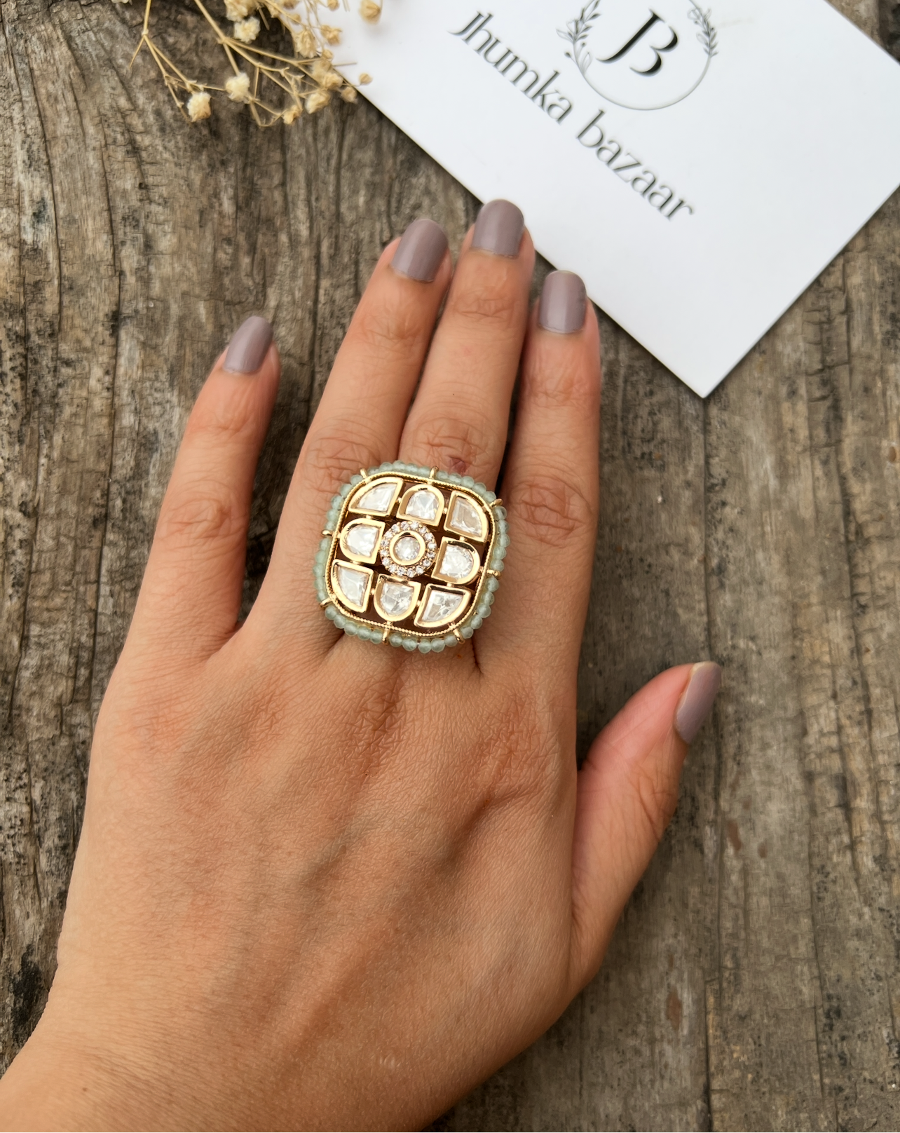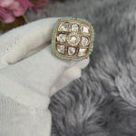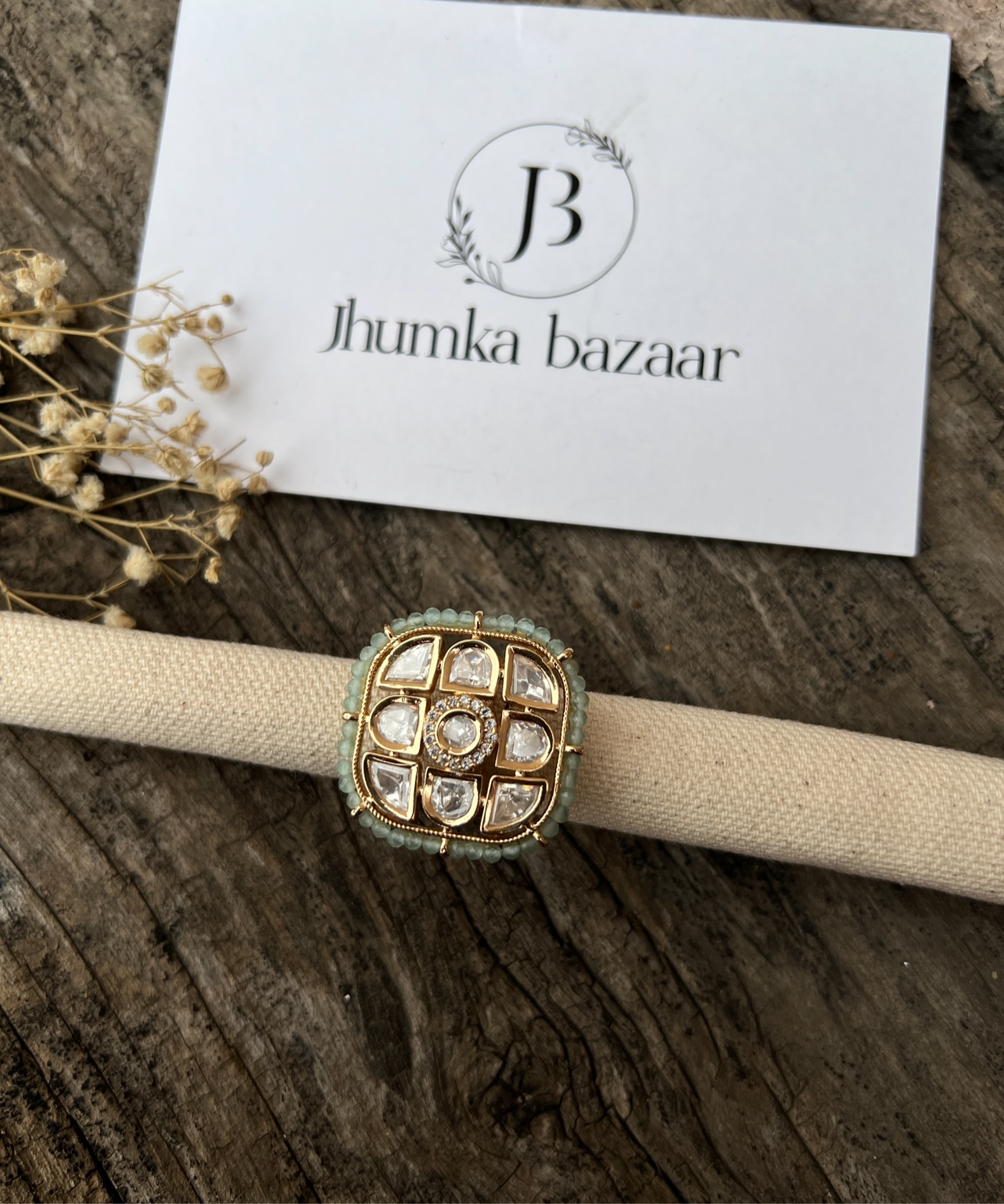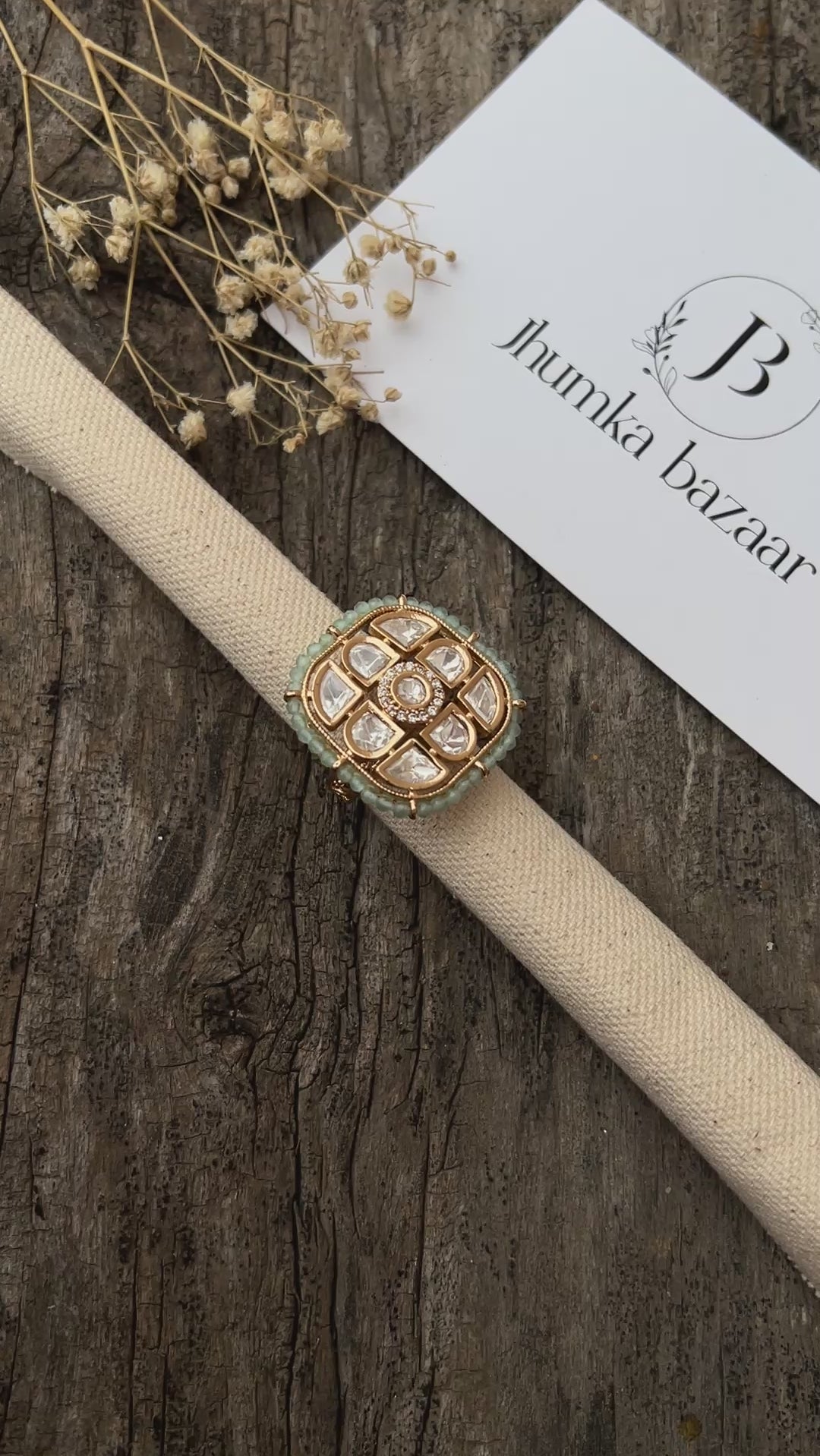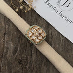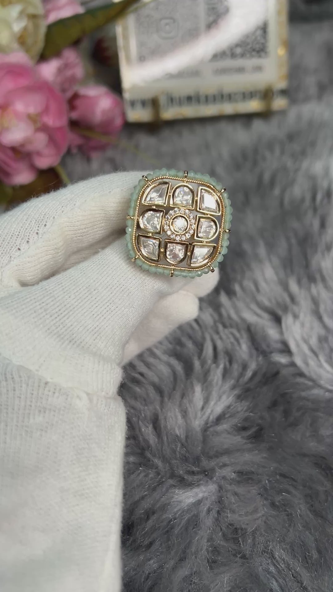 Real Kundan Polki Square Shaped Adjustable Ring- Mint